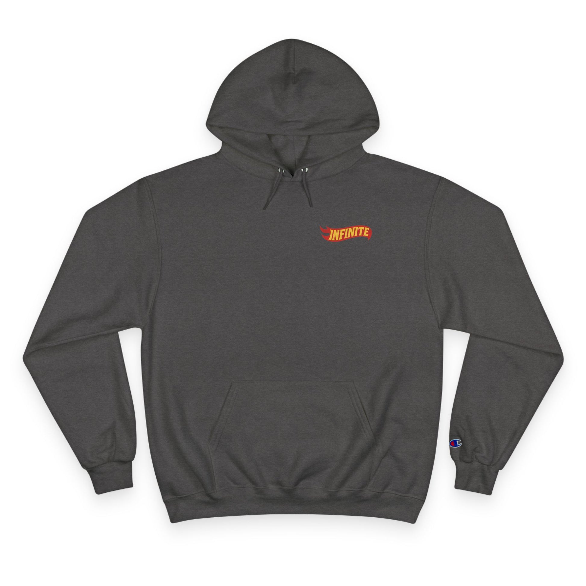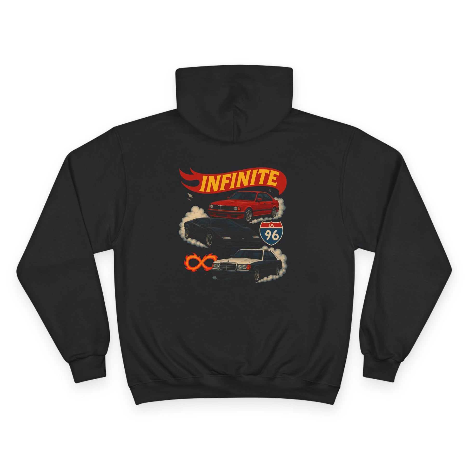 The Infinite Drift Hoodie features classic cars, a flaming infinity logo, and heavyweight cotton built for everyday wear.