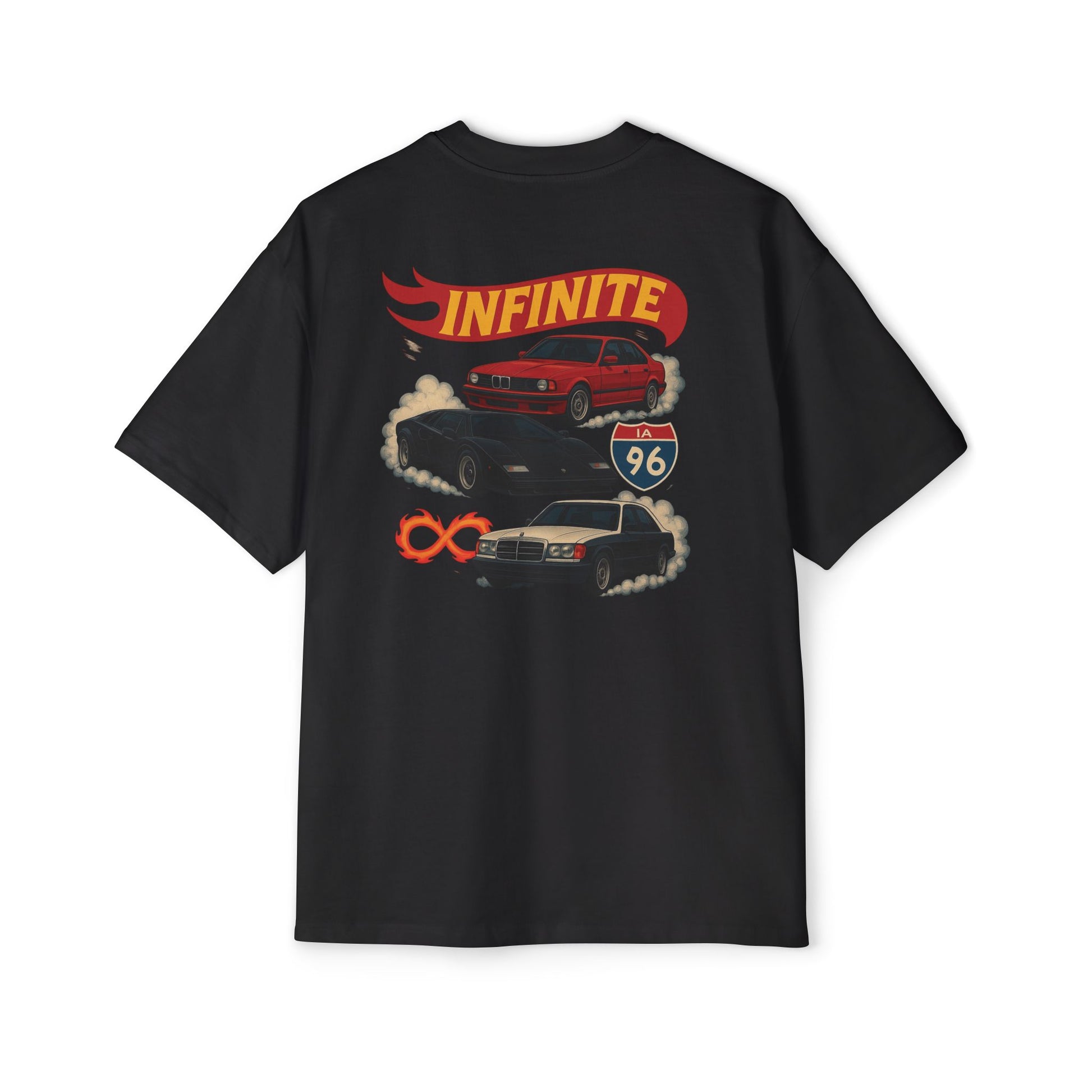 The Infinite Drift tee blends oversized comfort with bold retro style - featuring classic BMWs, a flaming infinity logo, and heavyweight cotton built for everyday wear.